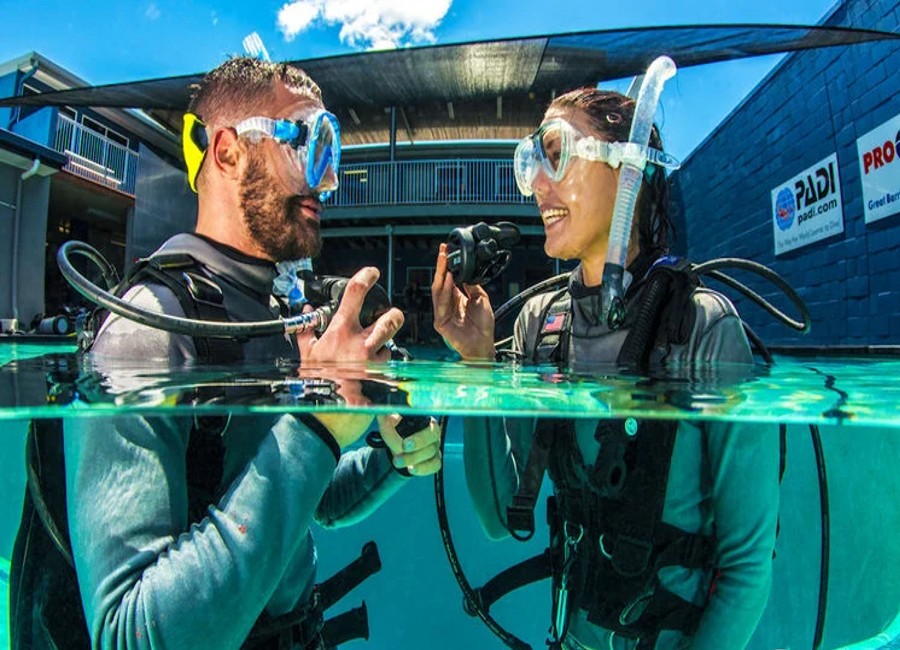 Our five-day PADI Open Water course is the most popular way to combine the adventure of learning to dive with the excitement of exploring the spectacular beauty of The Great Barrier Reef. Your first two days are on land doing pool and classroom theory at our five-star modern training centre. Then you will head out to the Great Barrier Reef for 3 day/2 night liveaboard trip. Whilst at the reef, you will have the opportunity to participate in up to nine dives. The first four dives are training dives, which will complete your PADI Open Water Certification. After these are completed, you can enjoy five fun dives, one of which is an exciting night dive guided by your dive instructor. This is a highly personalised certification course and you’ll have the same instructor for the entire duration